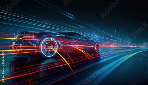 A car is driving down a road with a bright blue background. The car is surrounded by a colorful blur of light, giving the impression of a fast-moving vehicle. Scene is energetic and dynamic