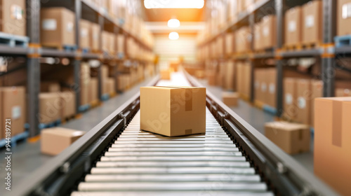 A cardboard box on a conveyor belt in a warehouse, showcasing efficient logistics and organized storage.