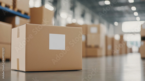 A cardboard box on a warehouse floor with more boxes in the background, suggesting storage, shipping, or logistics operations.