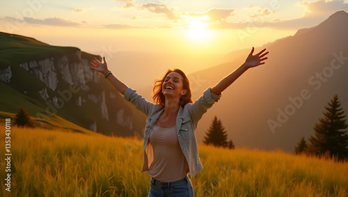 A Carefree Woman Embraces Nature on a Mountain Cliff at Sunset: Capturing Freedom, Serenity, and Joy in Outdoor Life - Perfect Photo Stock Concept with Empty Space for Text