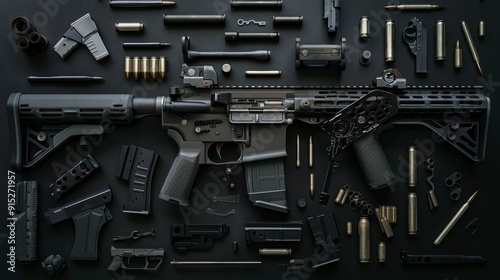 A carefully arranged display of black firearm components and bullets against a dark surface, emphasizing precision, order, and the seriousness of weaponry.