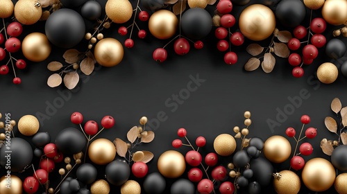 A carefully crafted display with glossy ornaments in black, gold, and red, perfect for adding festive flair to various occasions