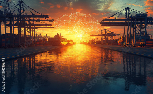 A cargo port at sunset with cranes and containers, featuring an illuminated world map overlay symbolizing global trade and logistics.