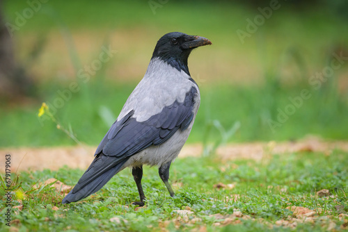 A carrion crow walking in a meadow on a cloudy day in spring