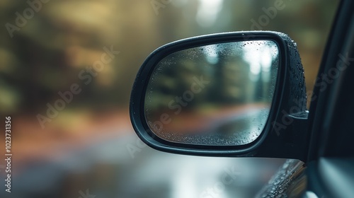 A car's side mirror reflects raindrops and a vibrant forest scene, showcasing the blurred yet colorful tones of autumn in the background while driving.