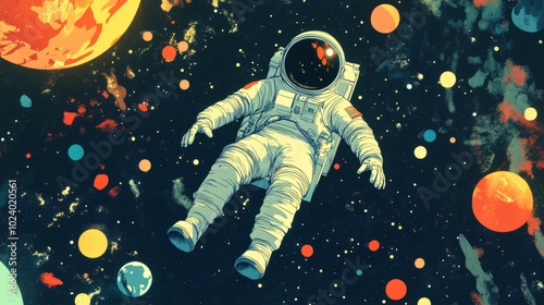 A cartoon astronaut floating in space, surrounded by colorful planets and stars