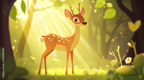 A cartoon deer standing gracefully in a forest clearing with sunlight filtering through the trees.