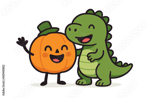 A cartoon dinosaur with a pumpkin for a head is depicted in both vibrant full color and stark black-and-white line art versions