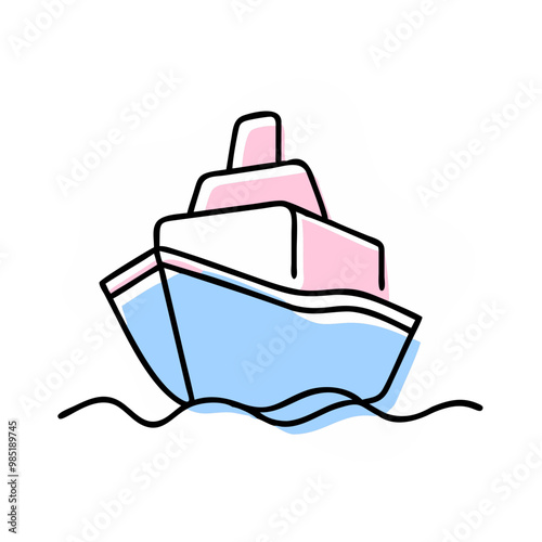 A cartoon drawing of a ship with a pink and blue color scheme. The ship is sailing in the ocean with a calm and peaceful mood