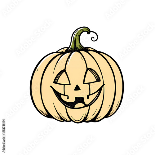 A cartoon drawing of a smiling pumpkin with a green stem on transparent background