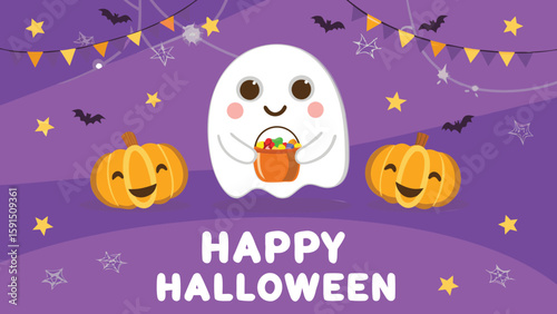 A cartoon ghost holding a bucket of candy between two smiling pumpkins for happy halloween day
