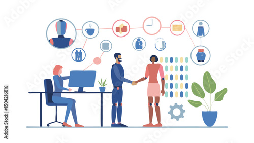 A cartoon illustration of a business meeting with diverse people and abstract business icons above them