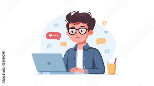 A cartoon illustration of a young man with dark hair and glasses sitting in front of a silver laptop. He is smiling and appears to be working or using the computer. The style is vector-based,