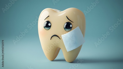 A cartoon tooth with a sad expression and a bandage.