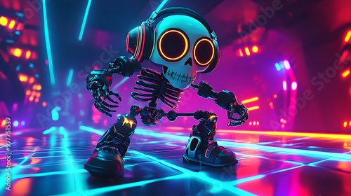 A cartoonish skull rocking oversized neon headphones, dancing amidst vibrant laser beams, with the neon-lit floor pulsating in rhythm to the music, cyberpunk style