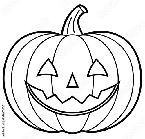 A carved orange Halloween pumpkin, or jack-o'-lantern, with a spooky face smiles in the autumn season