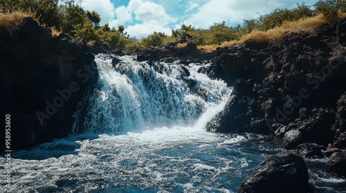 A cascading waterfall in a volcanic landscape, with black lava rocks and sparse vegetation.