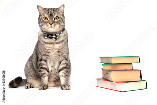 A cat in a bow tie and books isolated on a white background. The cat is learning