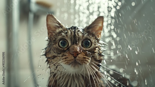 A cat in a shower with a playful look, water streaming down its face.