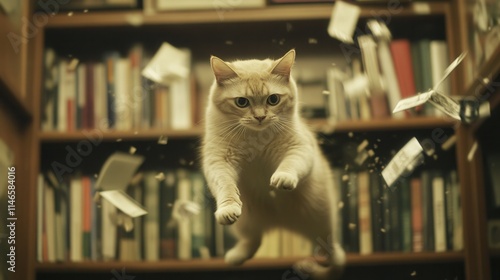 a cat mid-air, realizing its jump onto a shelf is a mistake as items start to fall around it.