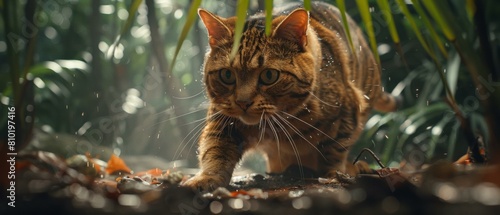 A cat walking through the forest in a dark area. Generative AI.