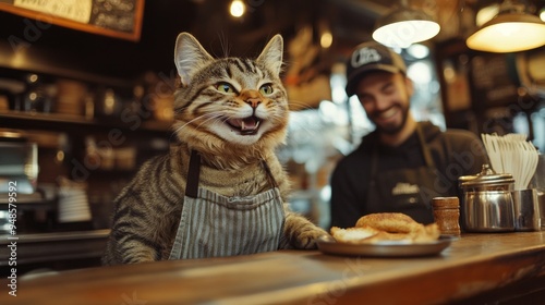 A cat wearing an apron is sitting at a counter with a plate of food