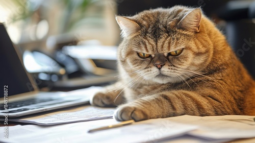 A cat with a stressed expression sits on an office desk chair, surrounded by paperwork and a laptop, conveying a sense of work-related stress.