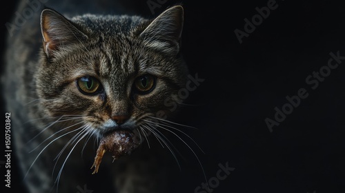a cat with just junt a prey and is on her mouth, the cat looking at the camera,