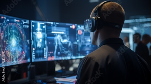A Caucasian man wearing headphones is looking at multiple computer screens displaying complex data visualizations.