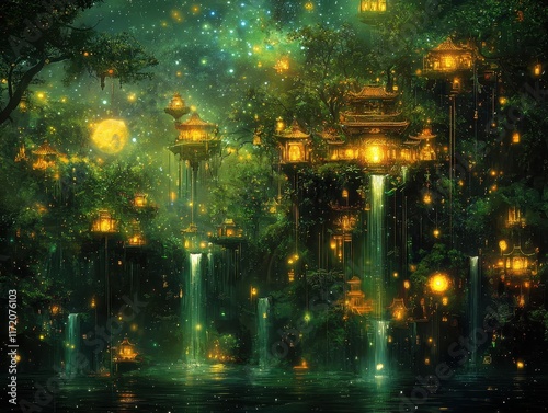 A celestial sky filled with floating islands, each glowing with unique magical energy. Waterfalls cascade from the edges into a vast expanse of shimmering clouds, and a radiant temple floats