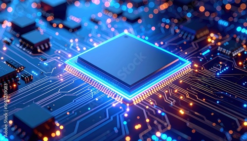 A central processor unit glows brightly, nestled within intricate circuitry on a motherboard.