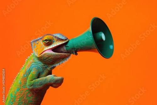 A chameleon lizard is depicted with its mouth open, holding a megaphone
