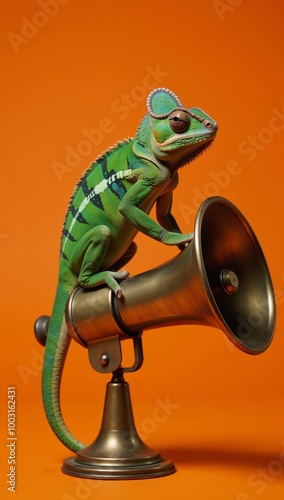A chameleon sits atop a vintage megaphone against an intense orange backdrop
