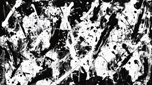 A chaotic, abstract black and white painting with splashes of paint and random lines.