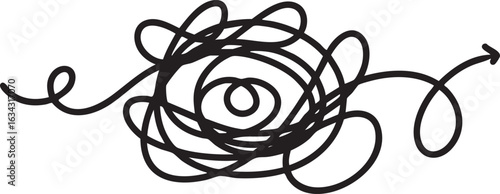 A chaotic, knot-like scribble from a single continuous black line. A tangled string or a messy thought process