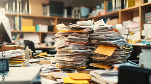 A chaotic office environment with stacks of papers and folders toppling off a crowded desk, cluttered workspace.
