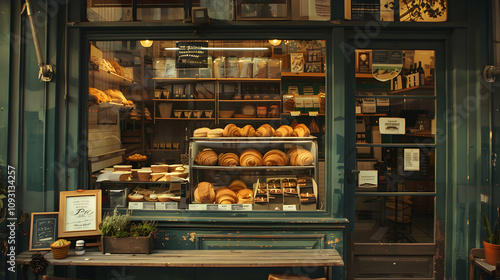 A charming bakery display showcasing a variety of fresh breads and pastries.