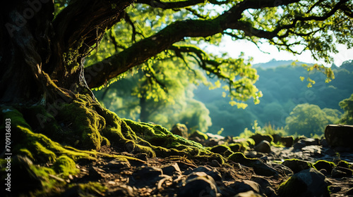A charming beautiful tree in a forest composition when the sun illuminates the whole scene. Generative AI