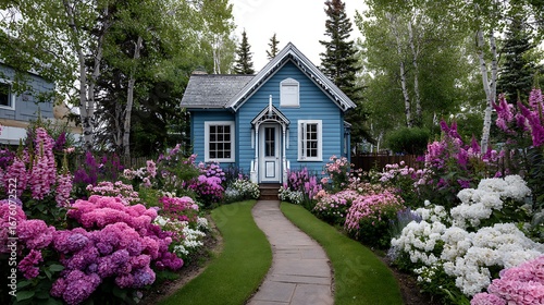 A charming blue house surrounded by vibrant flowers in a lush garden setting.