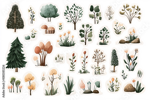 a charming collection of illustrated trees flowers and plants with various sizes and colors on a white background