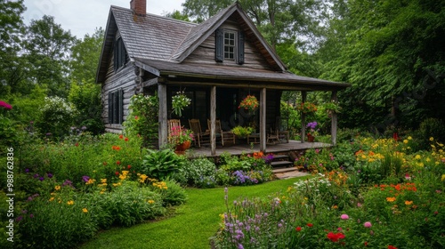 A charming garden house surrounded by lush greenery and colorful flowers, featuring a cozy porch with rustic furniture, inviting relaxation in nature