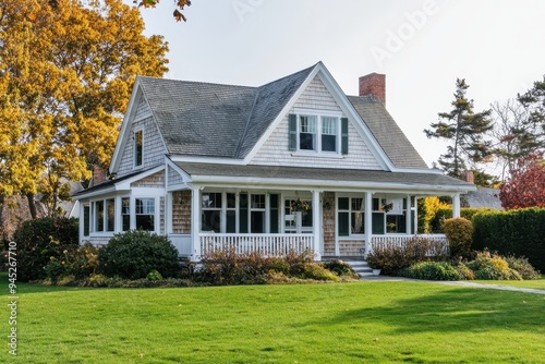 A charming house with a porch surrounded by greenery and autumn foliage.