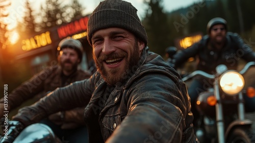 A charming image of a group of bikers smiling happily as they ride through nature showcases camaraderie, adventure, and the joy of freedom associated with motorcycle culture.