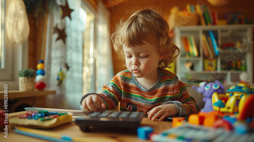 A charming little kid using a calculator, with a wooden table covered in colorful toys and books at home