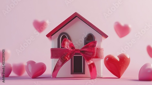 A charming miniature house wrapped in a red ribbon and bow, with pink hearts on either side, symbolizing love and celebration.