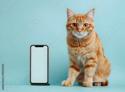 A charming orange cat sitting beside a blank smartphone on a vibrant blue background, perfect for pet and tech themes.