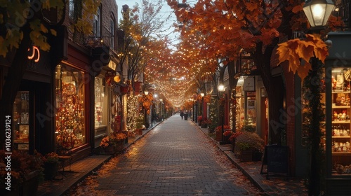 A charming shopping street adorned with autumn decorations and illuminated store windows, creating a cozy, festive atmosphere