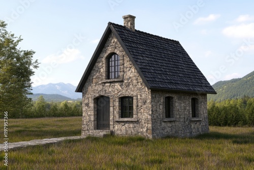 A charming stone cottage nestled in a verdant landscape with mountains in the distance and a tranquil pathway leading to the door