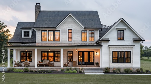 A charming two-story modern farmhouse with a striking gabled roof, black-framed windows, and a welcoming front porch, set in a peaceful, rural setting.
