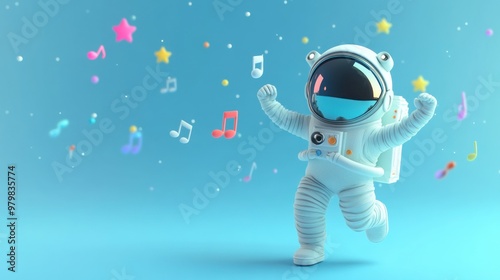 A cheerful astronaut dances amidst colorful musical notes in a vibrant space-themed background.